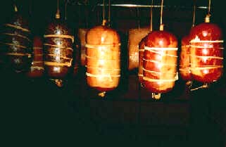 むらし終わった製品は、一度、冷たい乾燥した空気をあててやることで表面を乾燥させ、肉とケーシングの間にコラーゲンの皮膜を作ってやることで、この後の加熱でハムの旨みが外に流失しないよう製品の中に閉じ込めてしまいます。しっかり表面が乾燥した状態のものに林檎のチップで温燻状態のスモーキングをし、赤味がかかった美しい色合いに仕上げます。